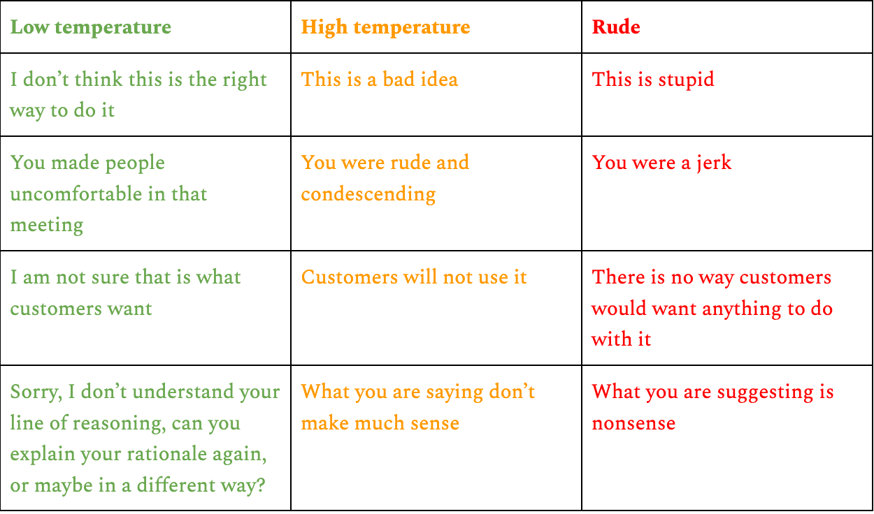 Here are some more examples of how the same message will sound at different temperatures. And yes, I wouldn't recommend using rudeness to get your point across, and yes, don't be rude even if you are right and the other person is wrong. If you ever go that far, you have to apologize to the other person.